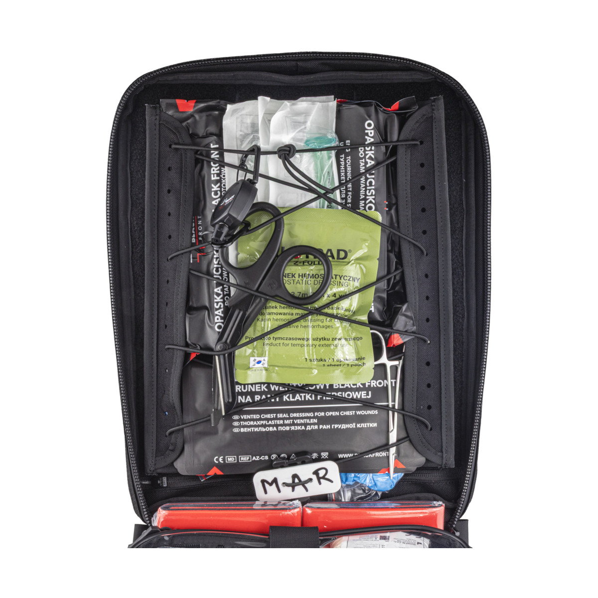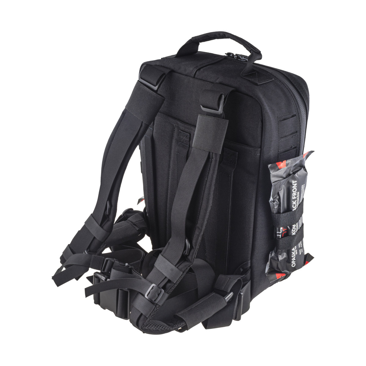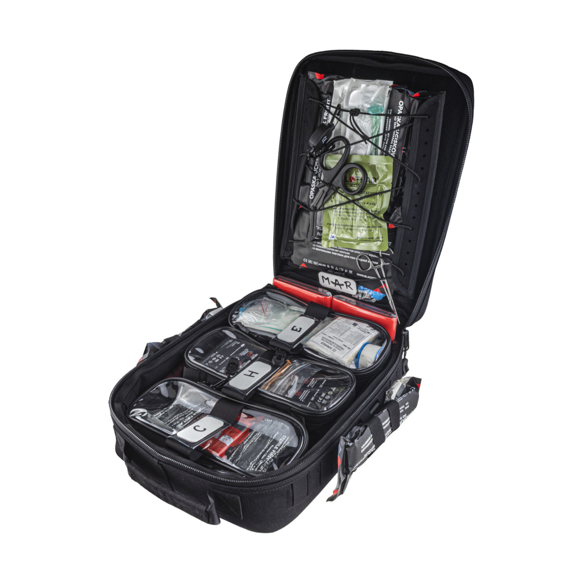 Zestaw ratowniczy INTERVENTION READY przeznaczony jest dla osób wyszkolonych w podstawach medycyny pola walki/działań w środowisku taktycznym. Wyposażenie rozplanowano tak, by usprawnić działanie ratownika zgodnie z protokołem MARCHE i umożliwić pomoc na poziomie TFC (Tactical Field Care). Atutami konstrukcji są: kompaktowe wymiary, wysoka odporność na uszkodzenia mechaniczne, opcje doposażenia (montaż dodatkowego sprzętu) oraz ergonomiczny system nośny, który nie ogranicza mobilności. Konfigurację wyposażenia dobrano tak, aby umożliwić szybkie tamowanie krwotoków, udrożnienie i zabezpieczenie dróg oddechowych, zaopatrywanie ran i urazów oraz przygotowanie do ewakuacji – zgodnie z aktualną praktyką pola walki. Zestaw jest dobrą bazą pod przygotowanie kompletnego plecaka – w zależności od stopnia wyszkolenia. W razie potrzeb zestaw można wyposażyć w sprzęt zgodny z rekomendacjami CoTCCC oraz dodatkowy sprzęt do interwencji medycznych (igły do obarczania odmy, zestawy QuickTrach, etc.)